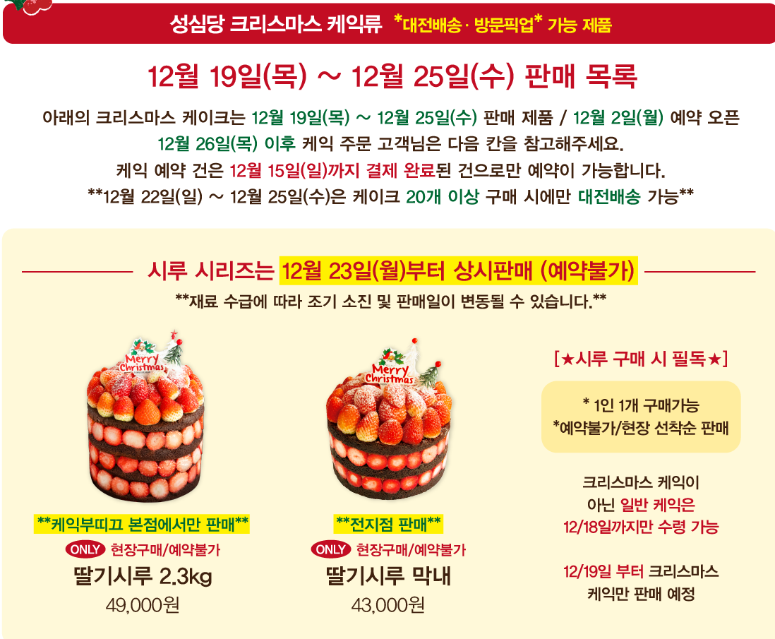 - 크리스마스 케이크는 12월 19일부터 판매 예정이며, 예약은 12월 2일부터 가능합니다.