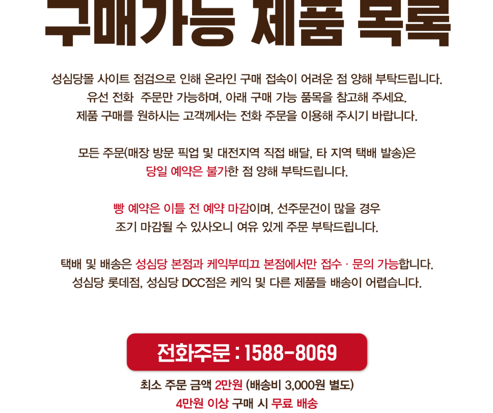 올해 성심당 크리스마스 케이크는 성심당몰 사이트 점검으로 구매 접속이 어려워 전화 주문과 현장 예약만 가능하다고 합니다.