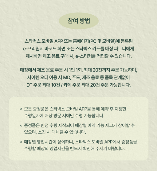 - 매장별 영업시간이 상이하니, 스타벅스 모바일 APP에서 증정품을 수령할 매장의 영업시간을 반드시 확인해 주시기 바랍니다.